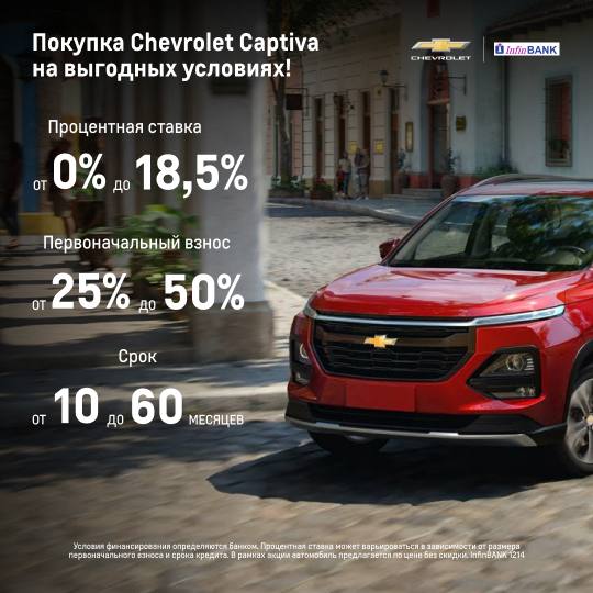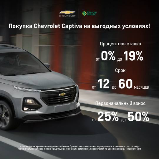 АО «UzAuto Motors» предлагает возможность приобрести автомобиль Chevrolet Captiva на выгодных условиях через банки Kapitalbank, InfinBANK, Tengebank и Asakabank одновременно.
