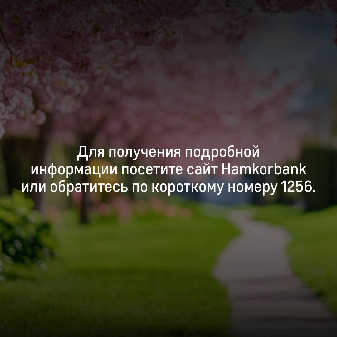 Для получения подробной информации посетите сайт Hamkorbank или обратитесь по короткому номеру 1256.