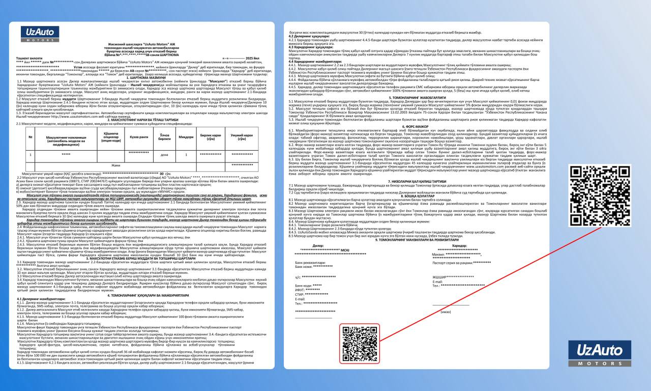 АО «UzAuto Motors» расширяет процессы цифровизации с целью обеспечения более удобного, прозрачного и надёжного обслуживания клиентов. Теперь договоры на приобретение автомобилей предоставляются со специальным QR-кодом.