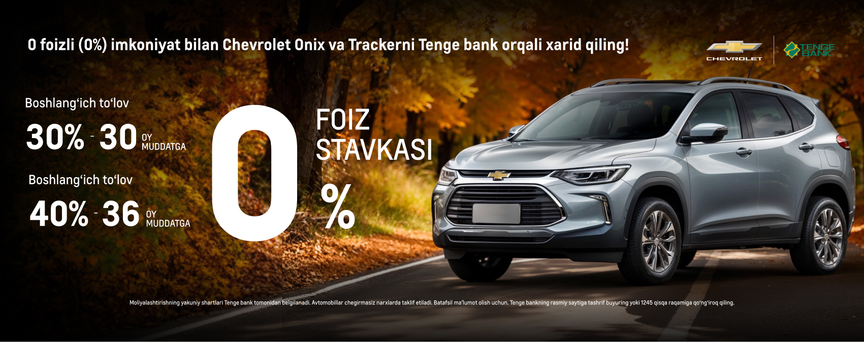 Tenge bank Chevrolet Onix va Tracker avtomobillarini foydali shartlarda xarid qilish imkoniyatini taqdim etadi.