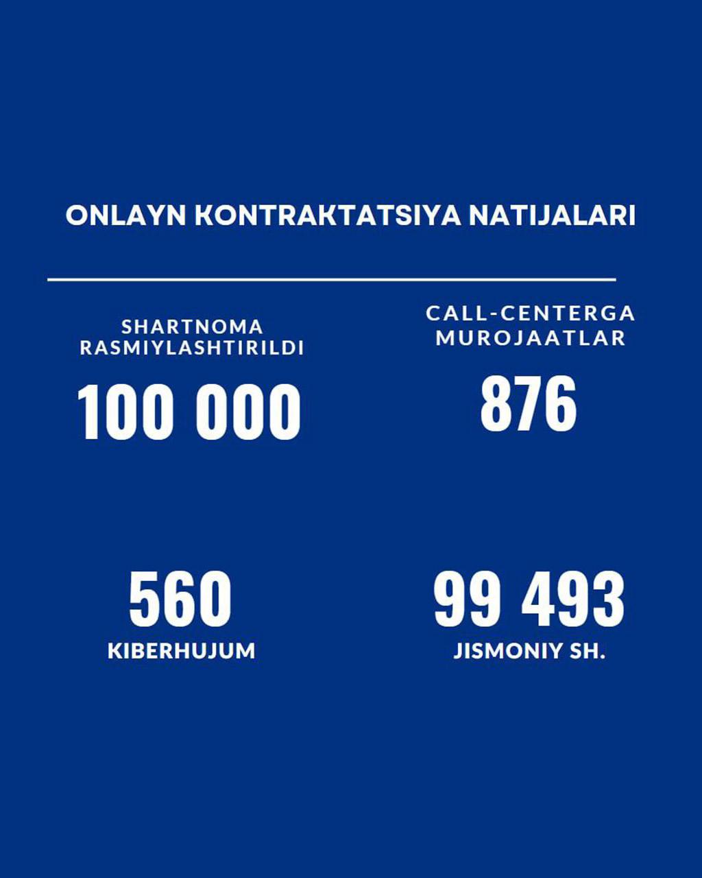 Jami 100 000 ta shartnoma rasmiylashtirilgan bo‘lib, shundan 99 493 tasi One ID tizimida ro‘yxatdan o‘tgan jismoniy shaxslarga, 507 tasi esa yuridik shaxslar ulushiga to‘g‘ri keladi. Kontraktatsiya jarayoni mobaynida kompaniya Call-markazi orqali 876 mijoz murojaati qabul qilindi. Kontraktatsiya jarayoni mobaynida UzAutoSavdo onlayn-savdo tizimi 560 ta kiberhujumga uchragan.