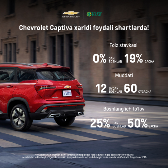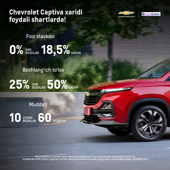 “UzAuto Motors” AJ Chevrolet Captiva avtomobilini bir vaqtning o‘zida Kapitalbank, InfinBANK, Tengebank va Asakabank orqali foydali shartlar asosida xarid qilish imkoniyatini taklif etadi.