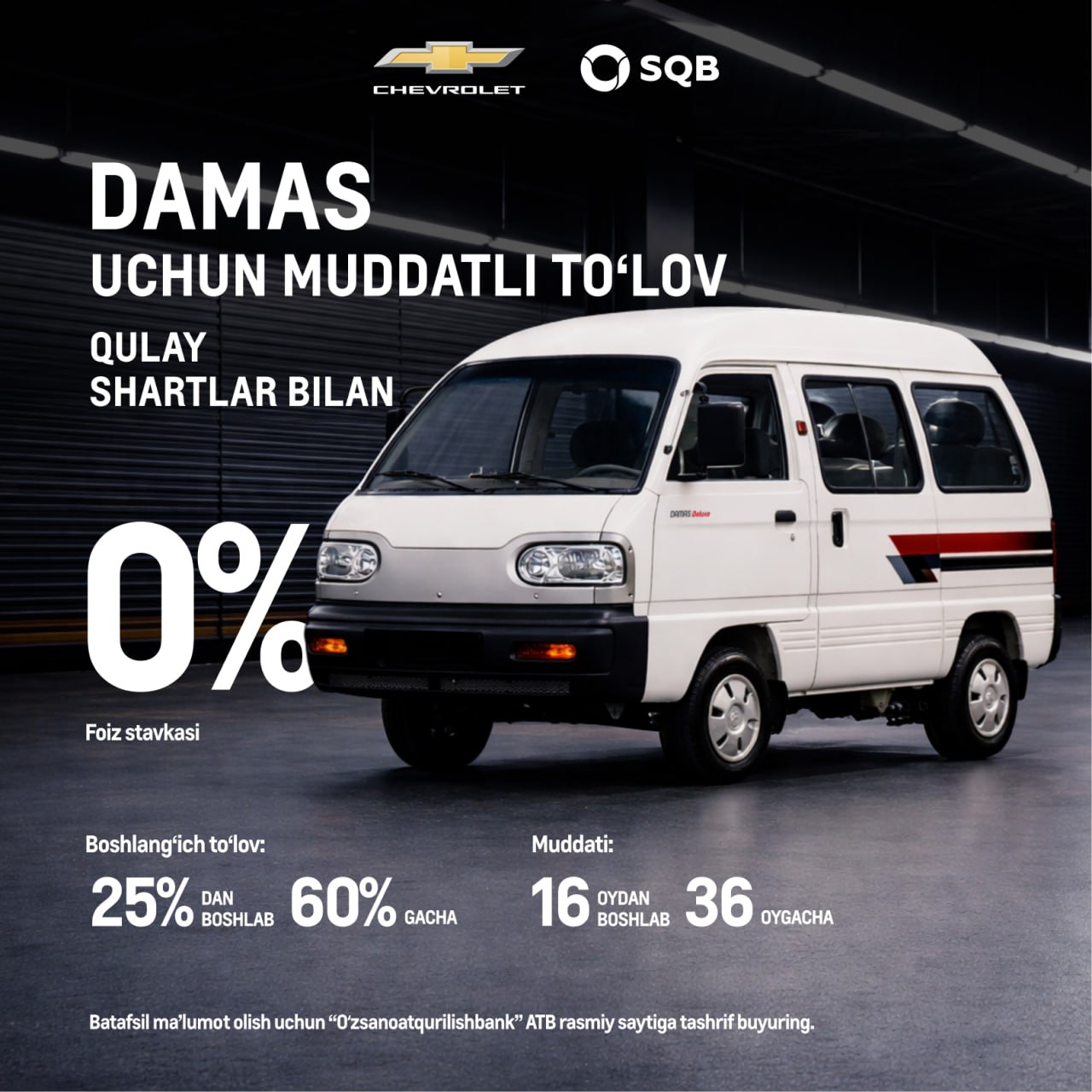 To‘lov muddati tanlangan model va boshlang‘ich to‘lov miqdoridan kelib chiqib belgilanadi. Avtomobillar chegirmasiz narxlarda taklif etiladi.
