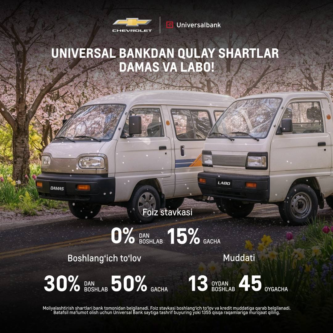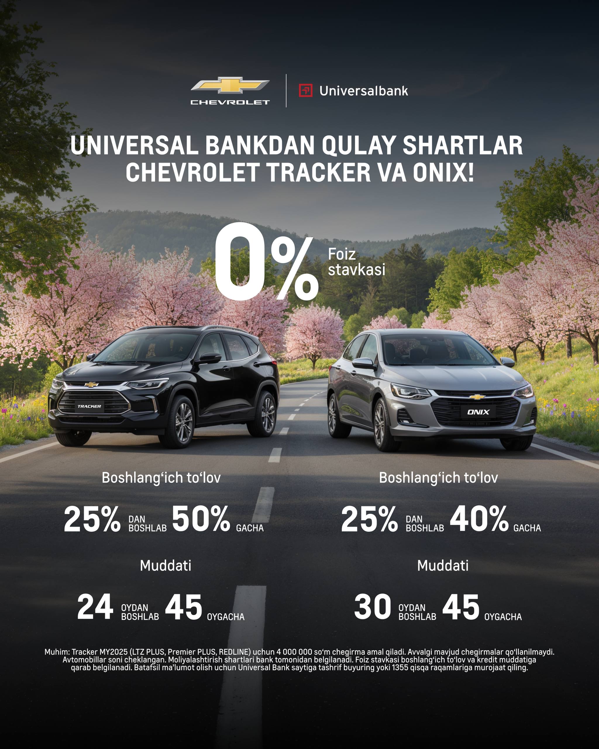 Maxsus hamkorlik dasturi doirasida Chevrolet Onix, Tracker, Damas va Labo avtomobillarini manfaatli shartlarda xarid qiling.