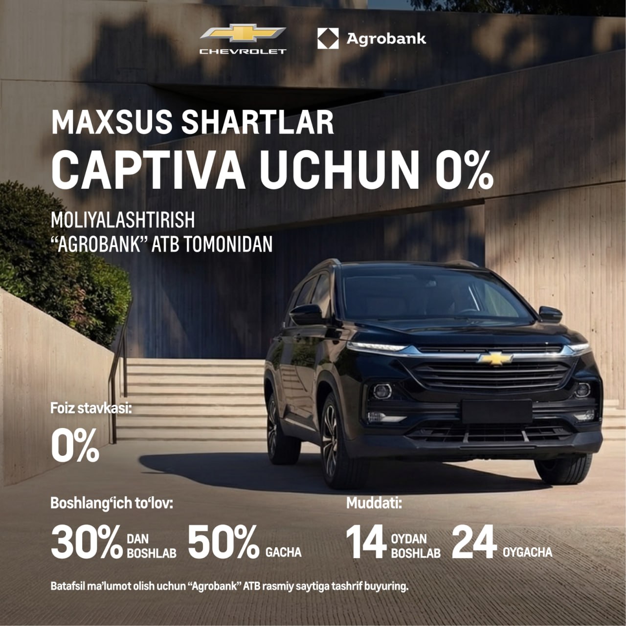 Moliyalashtirish shartlari “Agrobank” ATB tomonidan amalga kiritiladi. To‘lov muddati tanlangan model va boshlang‘ich to‘lov miqdoridan kelib chiqib belgilanadi. Avtomobillar chegirmasiz narxlarda taklif etiladi.