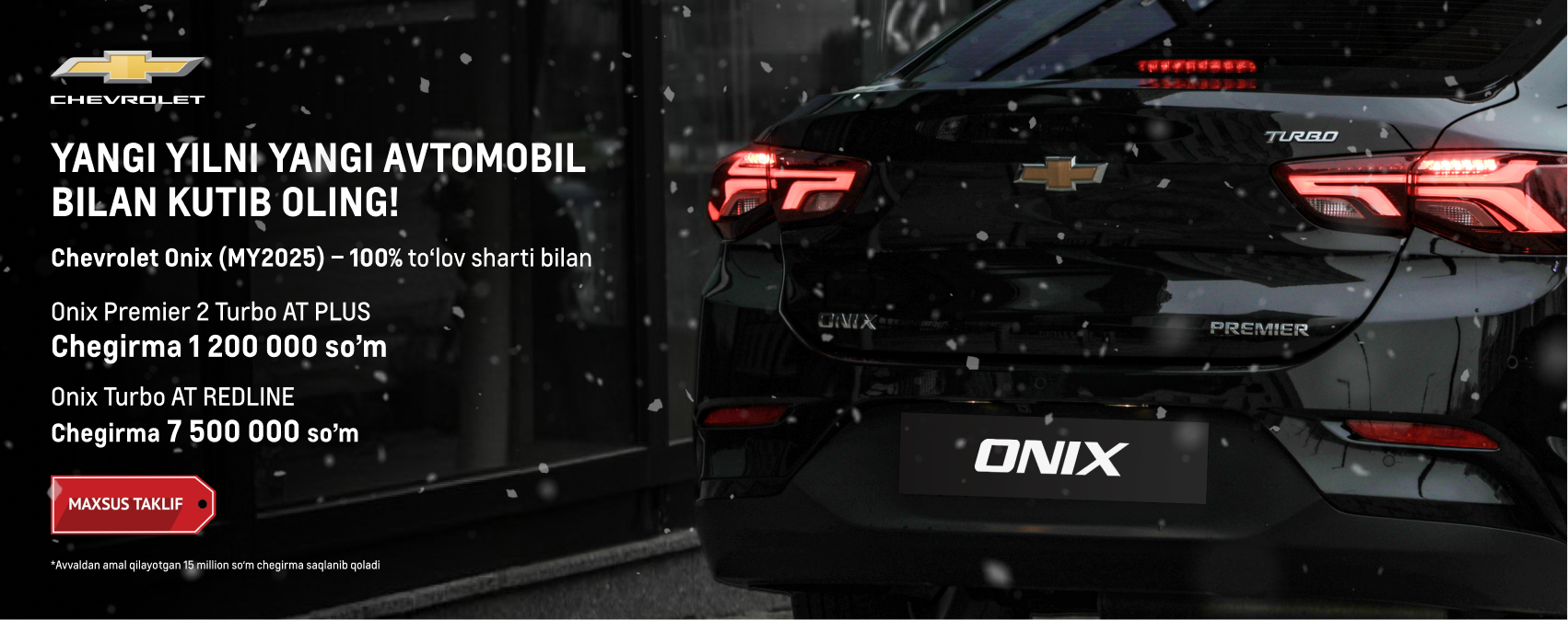 Aksiya doirasida xaridorlar Chevrolet Tracker va Onix MY2025 modifikatsiyali avtomobillarni 100 foiz to‘lov asosida mavjud chegirmalarga qo‘shimcha ravishda chegirmali narx bilan xarid qilishlari mumkin.