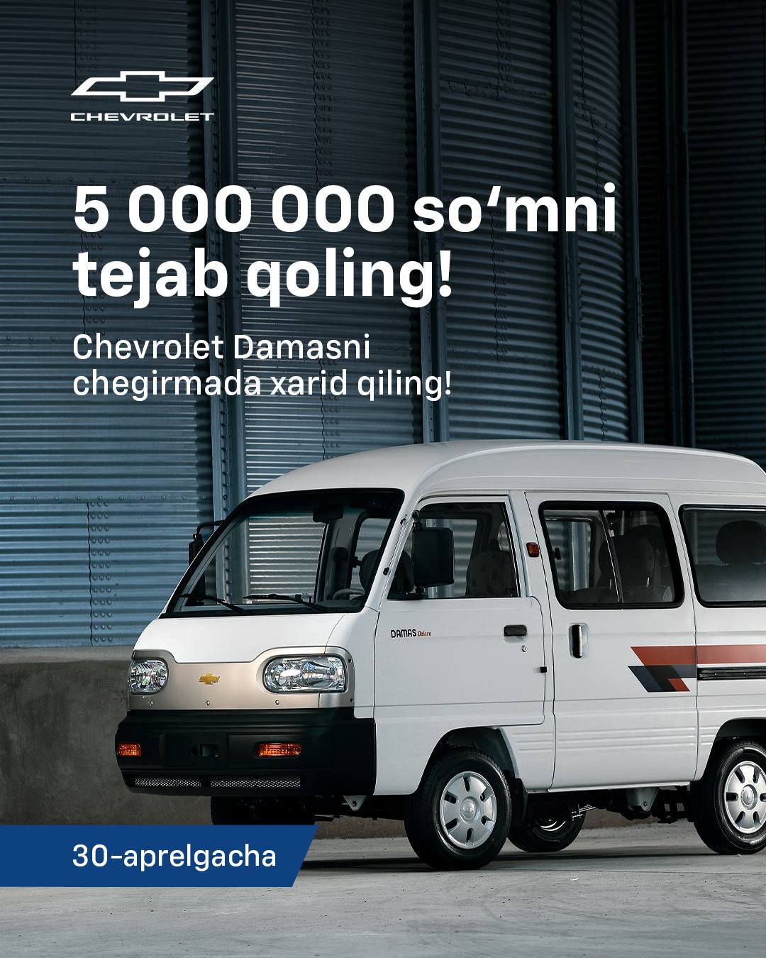 Chevrolet объявил скидку в 5 млн сум на автомобили Damas до 30 апреля🔥