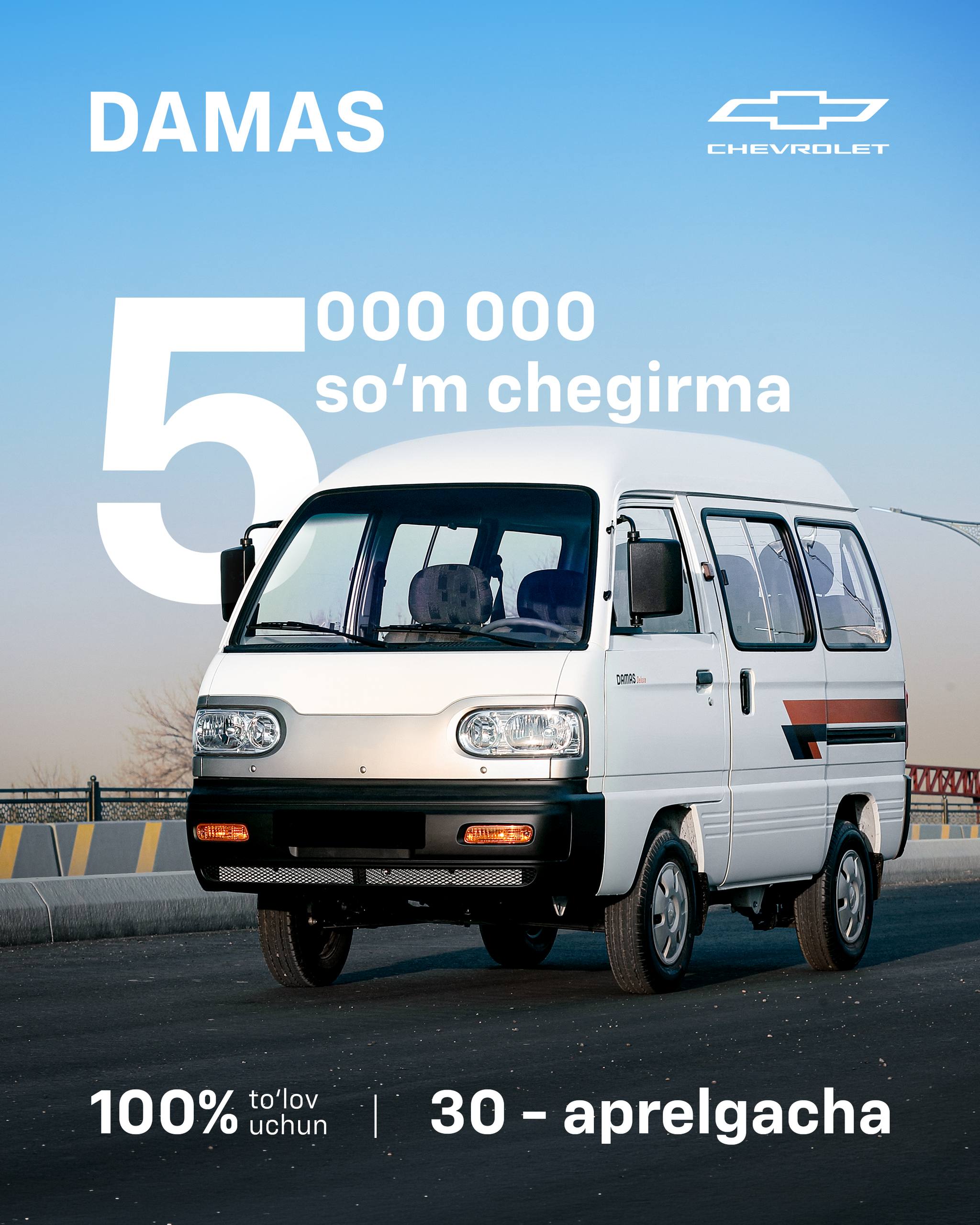До 30 апреля на автомобили Damas действует скидка 5 000 000 сумов при 100% оплате.