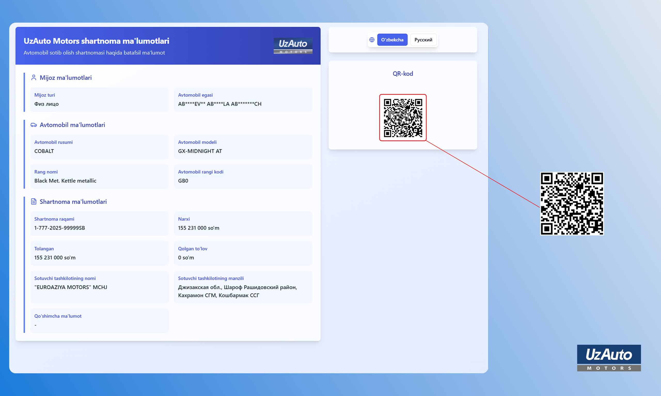 АО «UzAuto Motors» расширяет процессы цифровизации с целью обеспечения более удобного, прозрачного и надёжного обслуживания клиентов. Теперь договоры на приобретение автомобилей предоставляются со специальным QR-кодом.