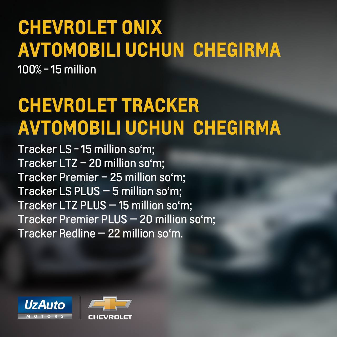 Shu bilan birga, Chevrolet Onix avtomobiliga 15 million so‘mlik chegirma davom etmoqda.