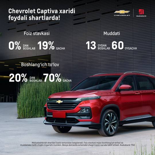 “UzAuto Motors” AJ Chevrolet Captiva avtomobilini bir vaqtning o‘zida Kapitalbank, InfinBANK, Tengebank va Asakabank orqali foydali shartlar asosida xarid qilish imkoniyatini taklif etadi.