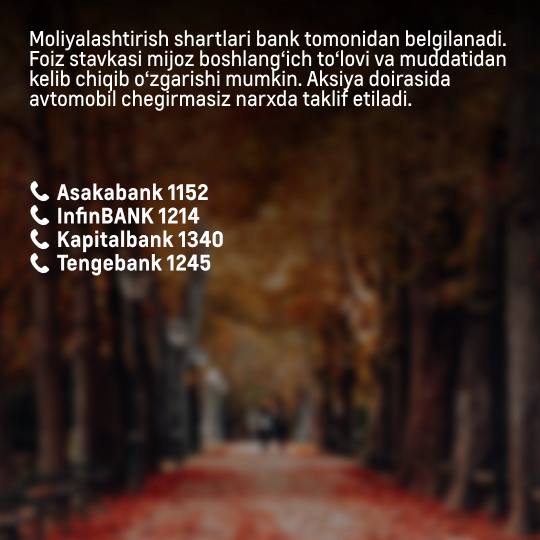 Moliyalashtirish shartlari bank tomonidan belgilanadi. Foiz stavkasi mijoz boshlang‘ich to‘lovi va muddatidan kelib chiqib o‘zgarishi mumkin. Aksiya doirasida avtomobil chegirmasiz narxda taklif etiladi.