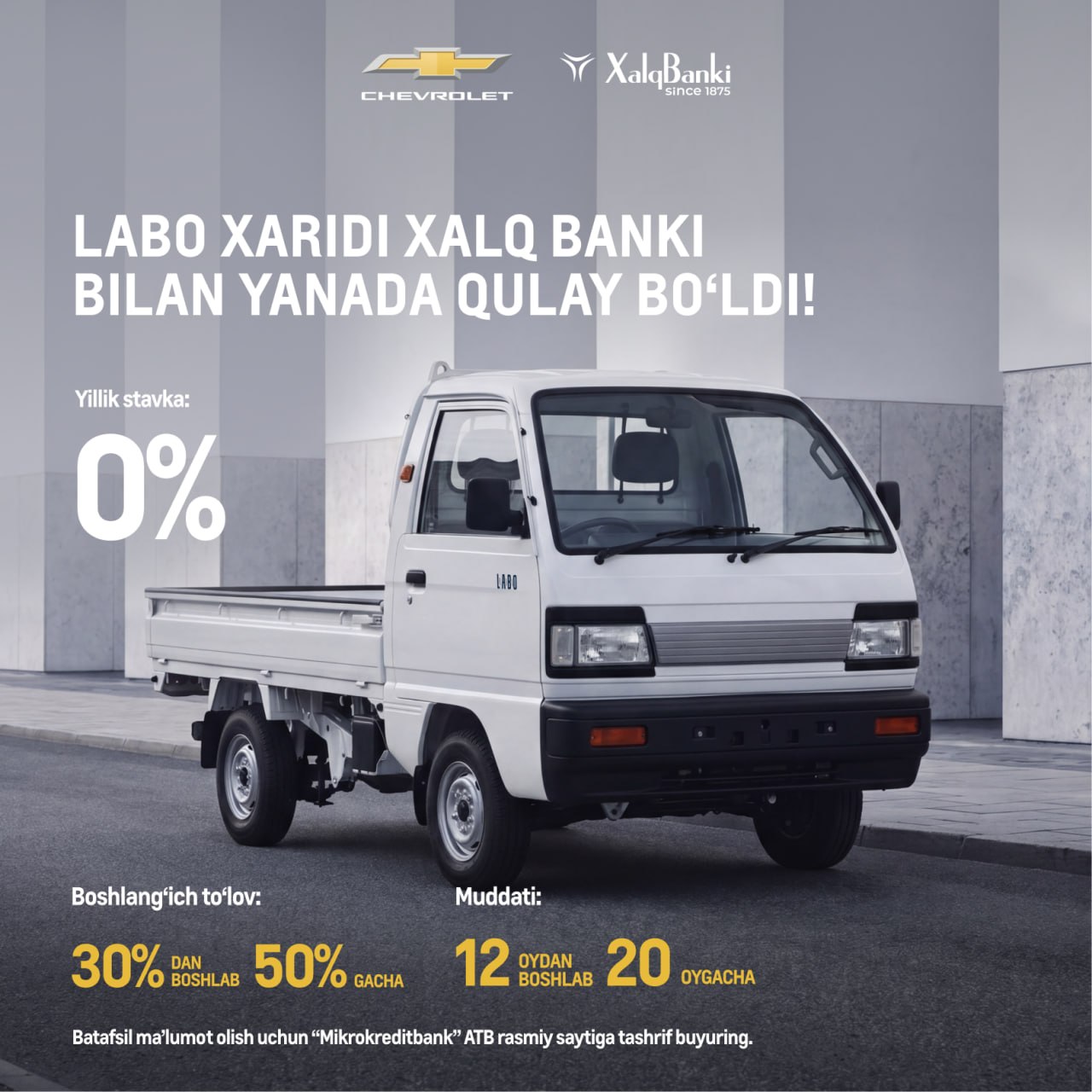 Damas, Labo va Captiva avtomobillarini tanlangan modelga qarab, 30% boshlang‘ich to‘lovdan boshlab, 22 oygacha muddatga foizsiz imtiyozli shartlar asosida xarid qilishingiz mumkin.