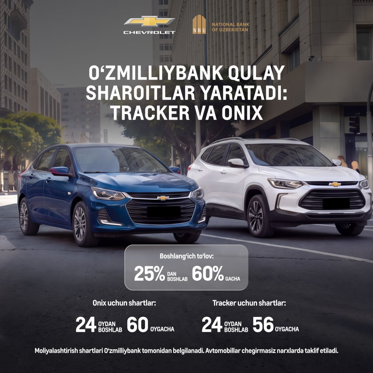 Mijozlar tanlangan model uchun amalga oshirilgan boshlang‘ich to‘lov miqdoriga qarab, Tracker avtomobilini 56 oygacha, Onix avtomobilini esa 60 oygacha foizsiz muddatli to‘lov asosida xarid qilish imkoniyatiga ega.