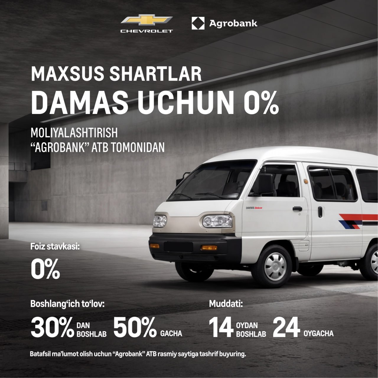 Moliyalashtirish shartlari “Agrobank” ATB tomonidan amalga kiritiladi. To‘lov muddati tanlangan model va boshlang‘ich to‘lov miqdoridan kelib chiqib belgilanadi. Avtomobillar chegirmasiz narxlarda taklif etiladi.